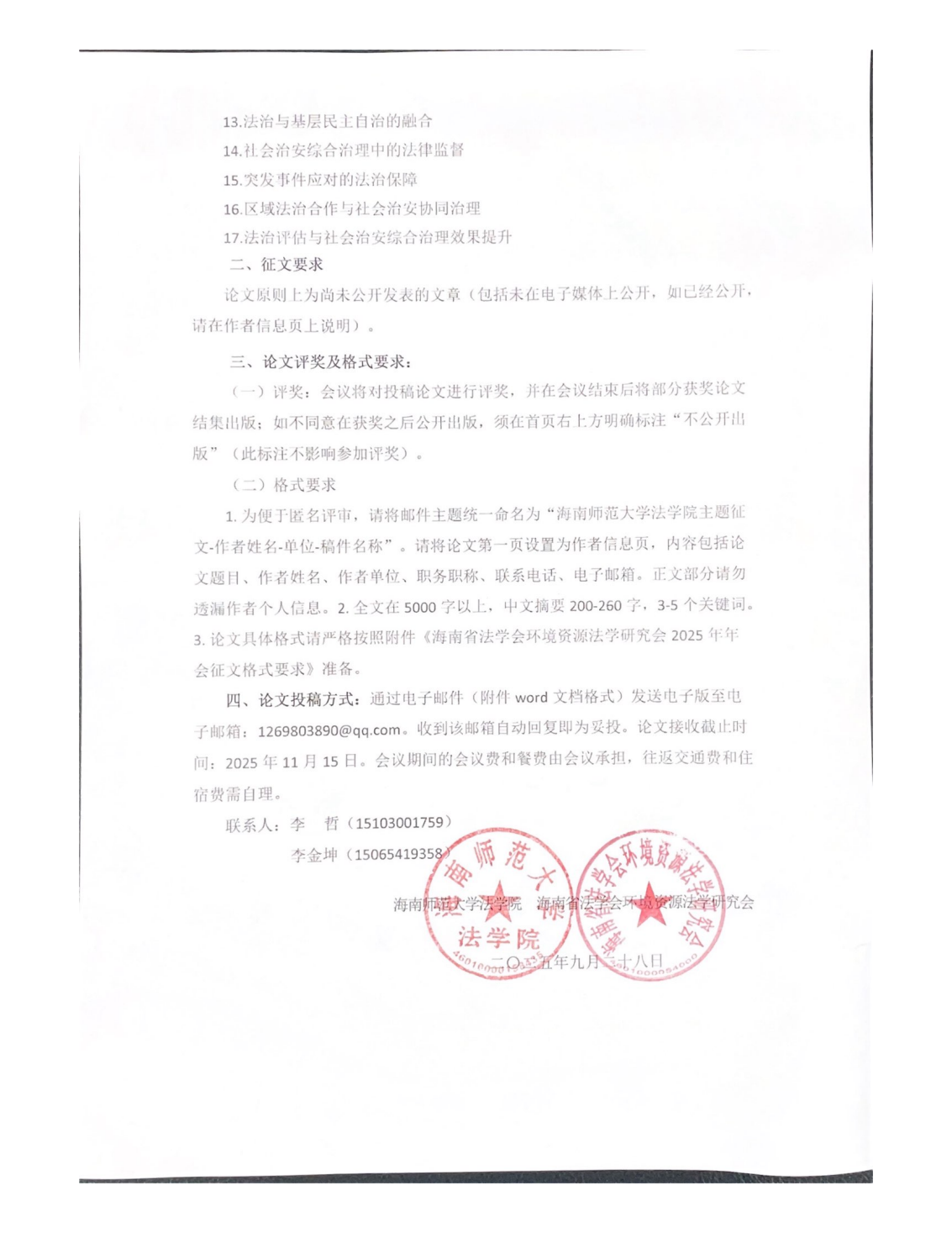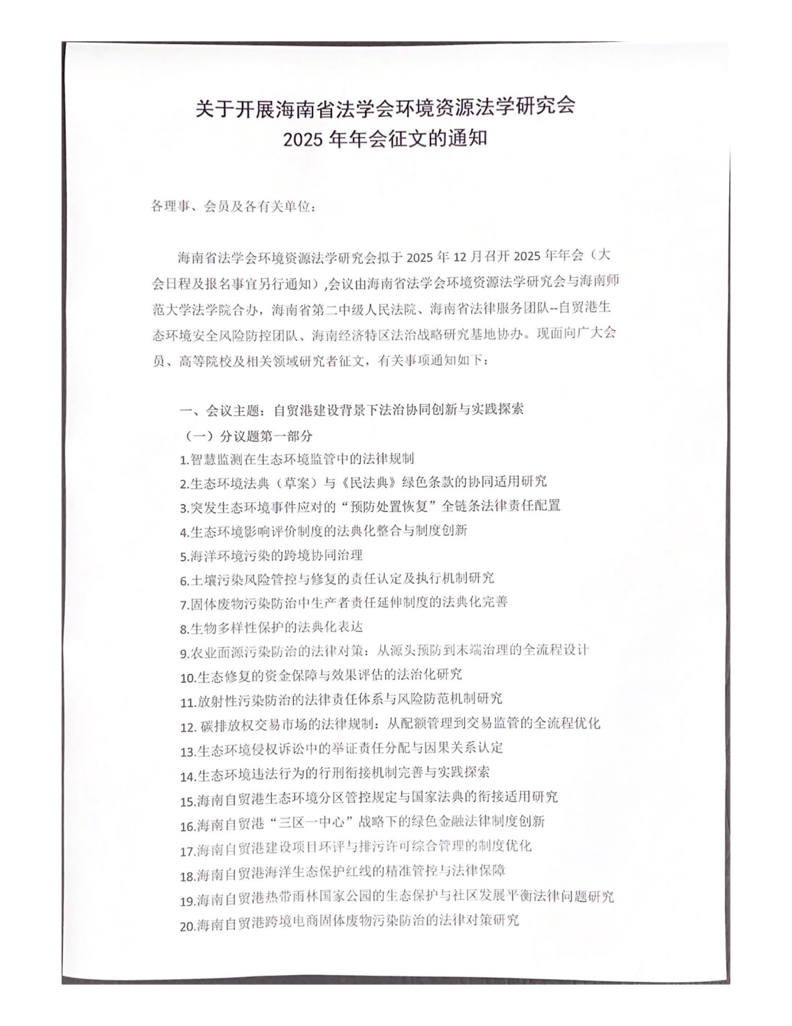 关于开展海南省法学会环境资源法学研究会2025 年年会征文的通知