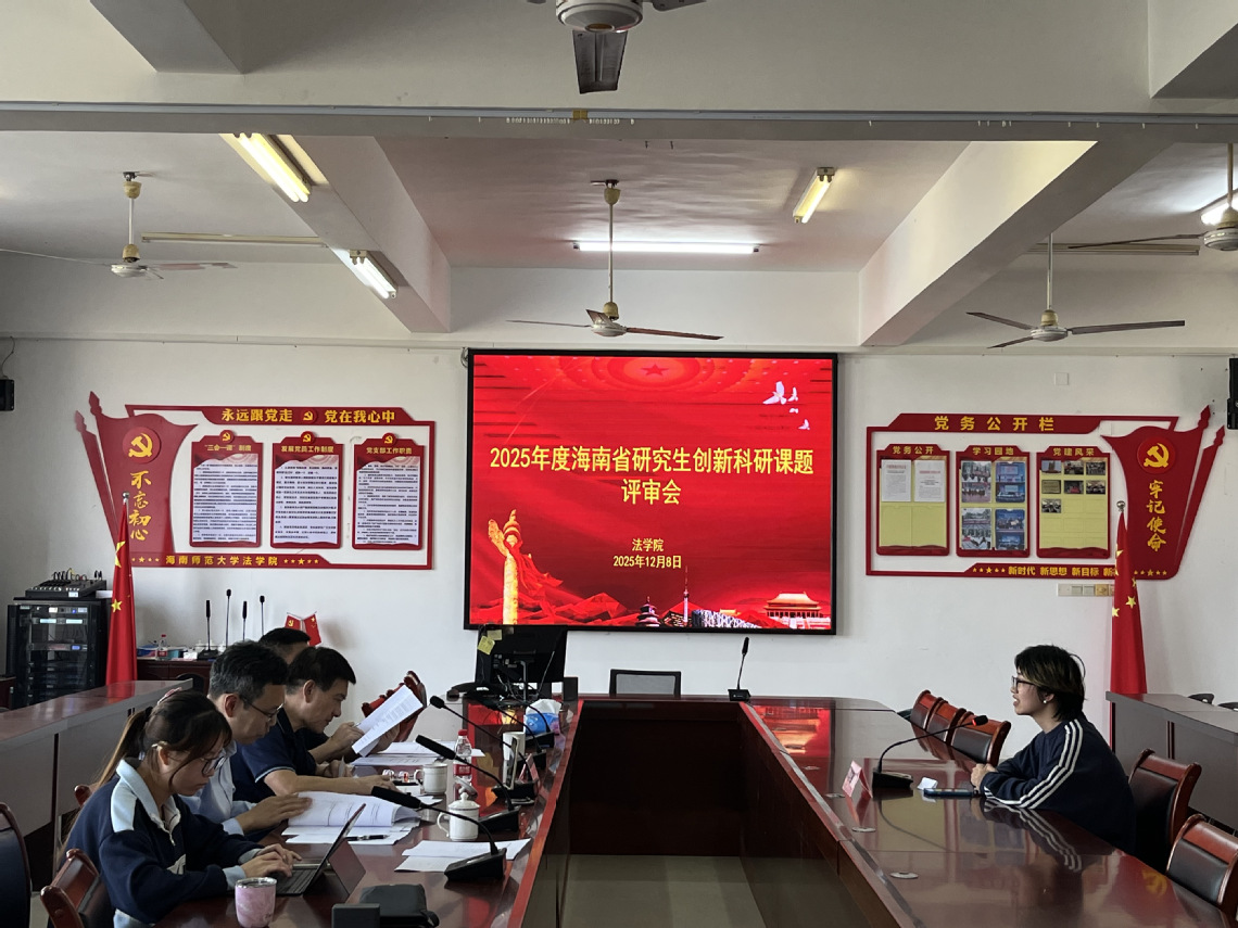 12月8日上午,我院在桂林洋校区学院会议室举行2025年度海南省研究生创新科研课题评审会。根据研究生院《关于组织开展2025年度海南省研究生创新科研课题申报工作的通知》(海师研函[2025]135号)的要求,为公平、公正、公开地开展此次评审会,学院组织了5名专任教师组成评审组,并实行课题申请人导师回避制度,通过评委老师线上、线下相结合的方式举行现场汇报答辩评审会。