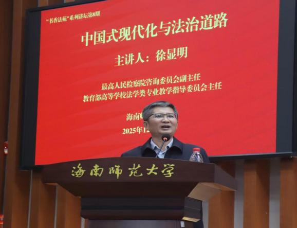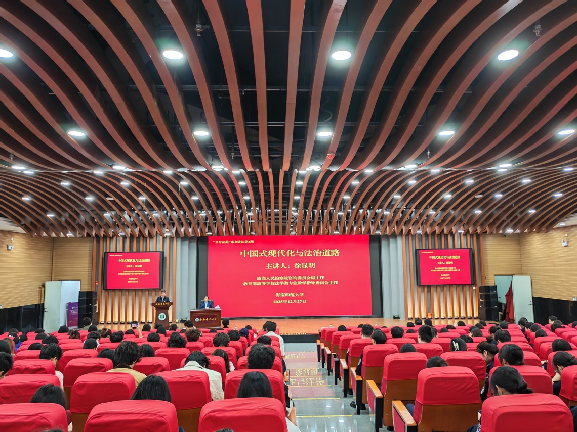 12月27日下午,我院“书香法苑”系列讲坛第8期在桂林洋校区图书馆一楼报告厅举行,特邀最高人民检察院咨询委员会副主任、教育部高等学校法学类专业教学指导委员会主任徐显明教授作题为《中国式现代化与法治道路》的专题报告。校党委副书记、校长聂清斌出席报告会,会议由校党委常委、副校长杨兹举主持。我院党委书记王承毅,院长张霞,副院长周兆进,教师代表张红昌、王伟,法律出版社法律翻译与出版研发中心主任朱峰,以及学院研究生、本科生、专升本学生代表共计三百余人参加报告会。