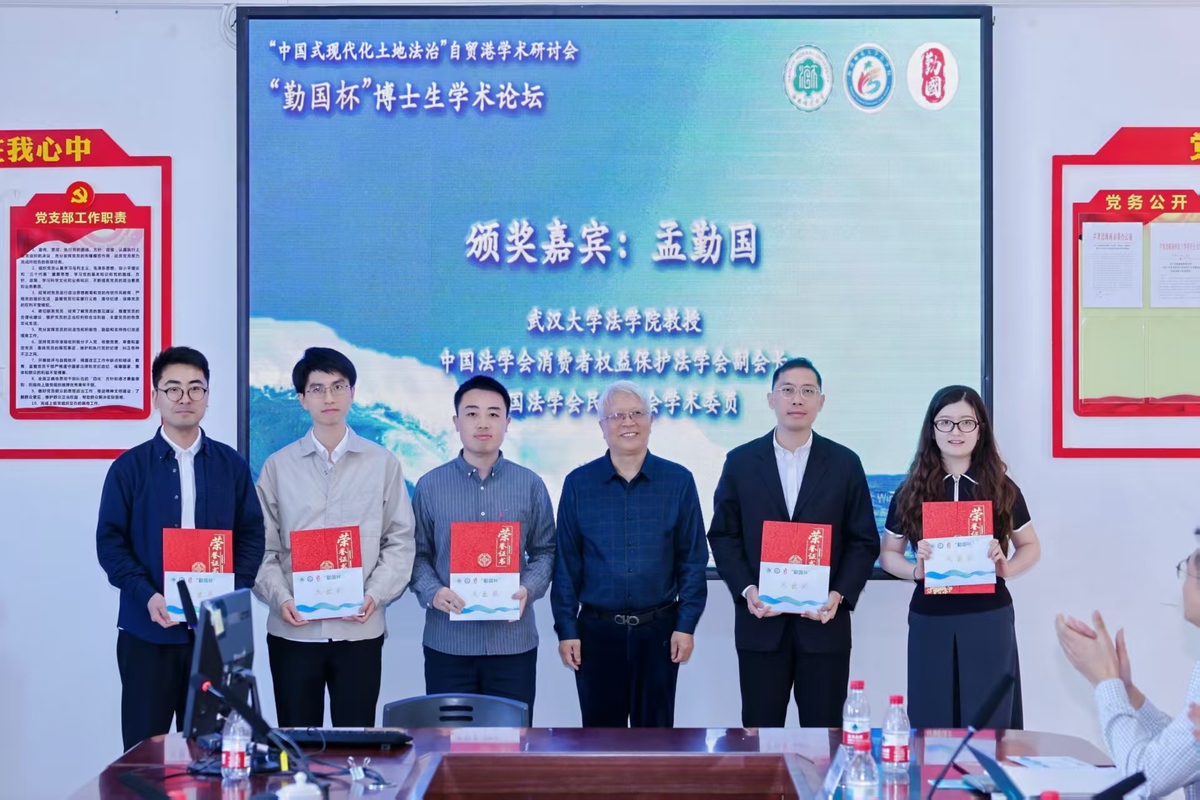 武汉大学法学院教授、中国法学会消费者权益保护法学会副会长、中国法学会民法学研究会学术委员孟勤国,海南勤国律师事务所主任贺婵娟为获奖博士论文颁奖。