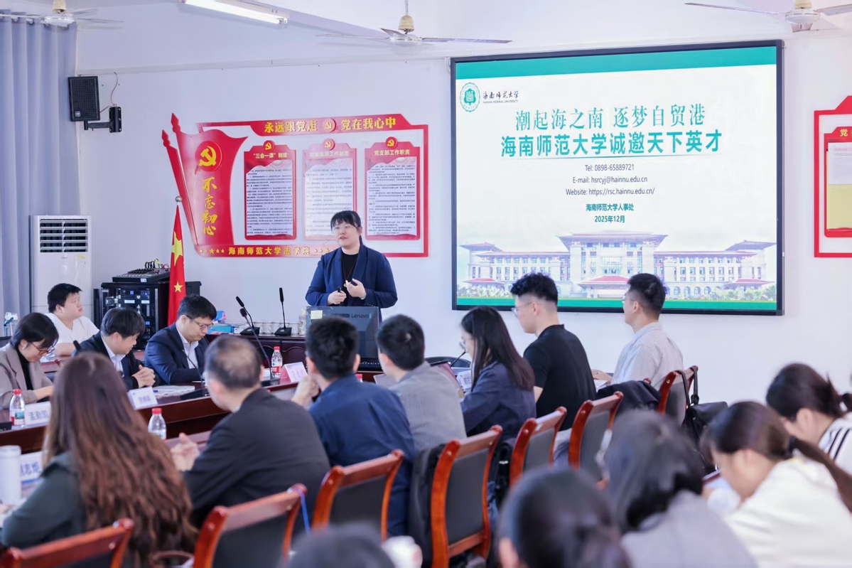 随后,海南师范大学人事处人才工作科科长罗丽彤系统分享了海南自贸港的人才政策体系,详细介绍了海南师范大学的学科发展特色及人才引进待遇,重点解读了“南海新星”“拔尖人才”等专项支持计划的申报条件与政策红利,鼓励博士们把握自贸港建设红利期,积极投身于海南的学术研究与事业发展。