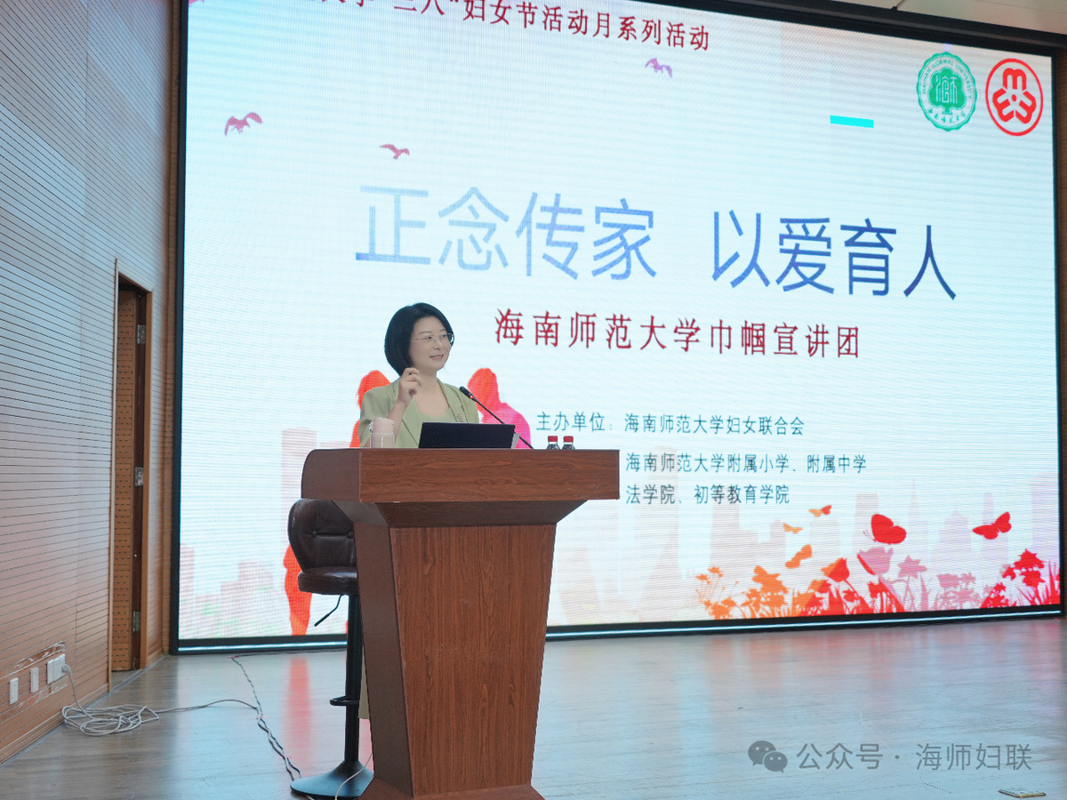 3月22日,海南师范大学巾帼宣讲团“正念传家,以爱育人——正念沟通破解亲子困境,培育优良家风”主题宣讲在海南省图书馆报告厅举行。本次活动由校妇女联合会主办,法学院、附属小学、附属中学、初等教育学院协办,校妇联负责人主持。