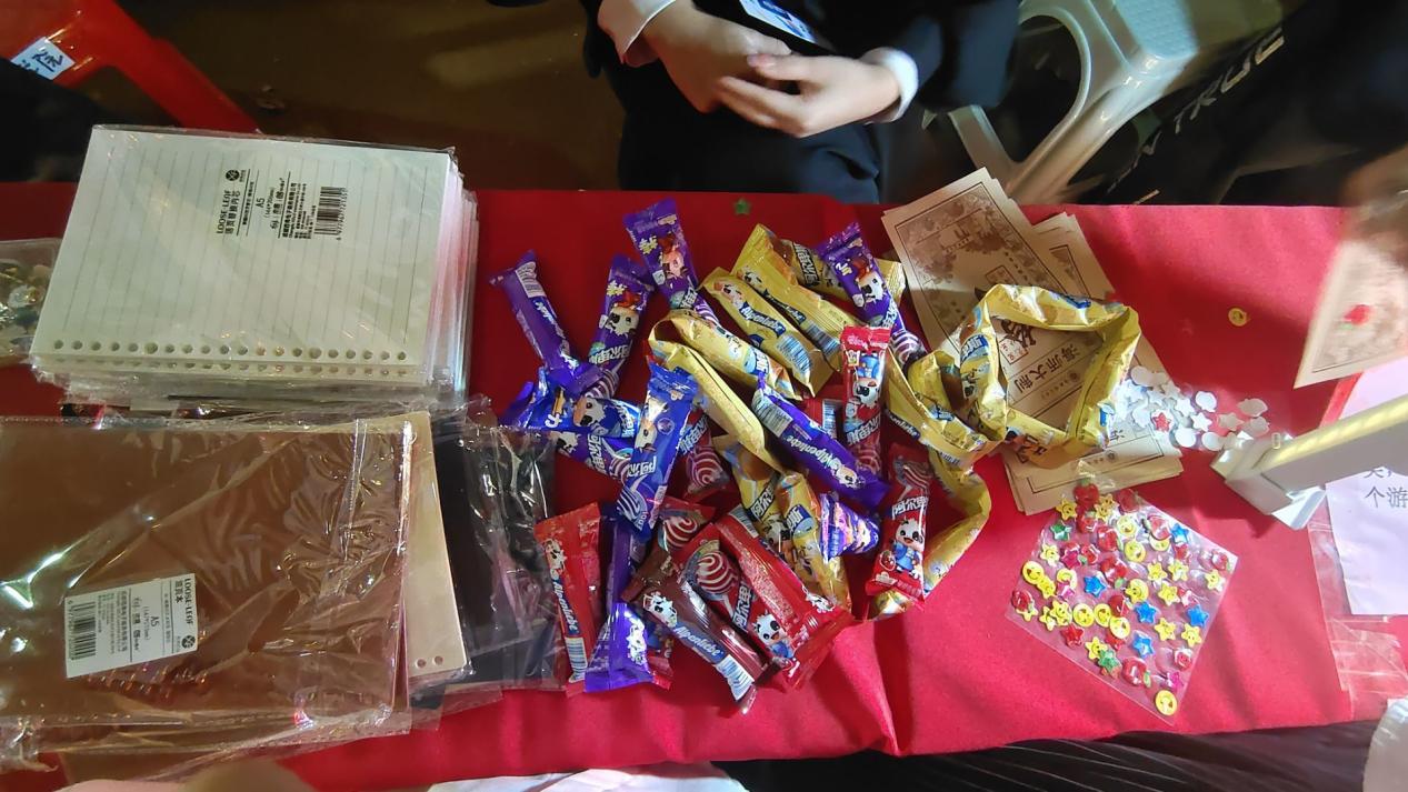 在本次游园活动的兑奖区里,有可爱的糖葫芦、小马公仔、温馨的小夜灯、精致的拼接积木和蝴蝶书签等礼品。活动现场气氛热烈,同学们通过完成游戏收集贴纸,兑换各类奖品。
